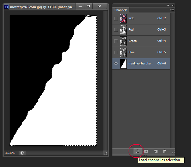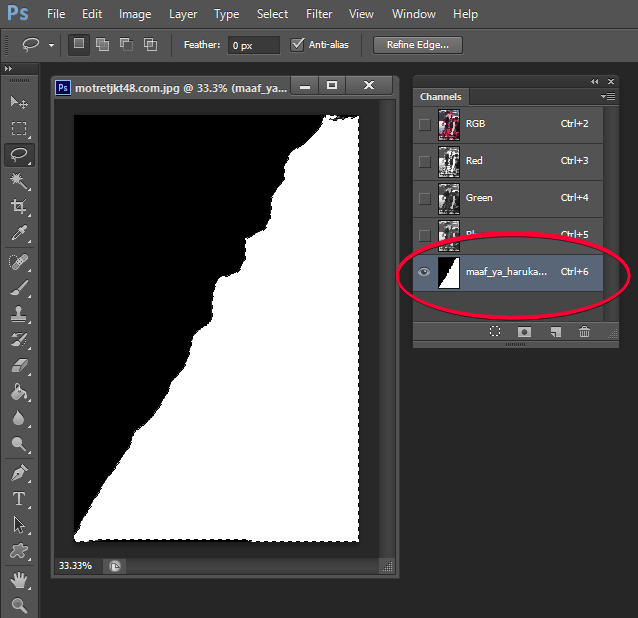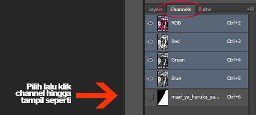Klik channel RGB. Langkah 6 dan 7 ini tujuannya agar kita kembali ke channel seperti awal namun sudah mempunyai seleksi yang tidak rata.