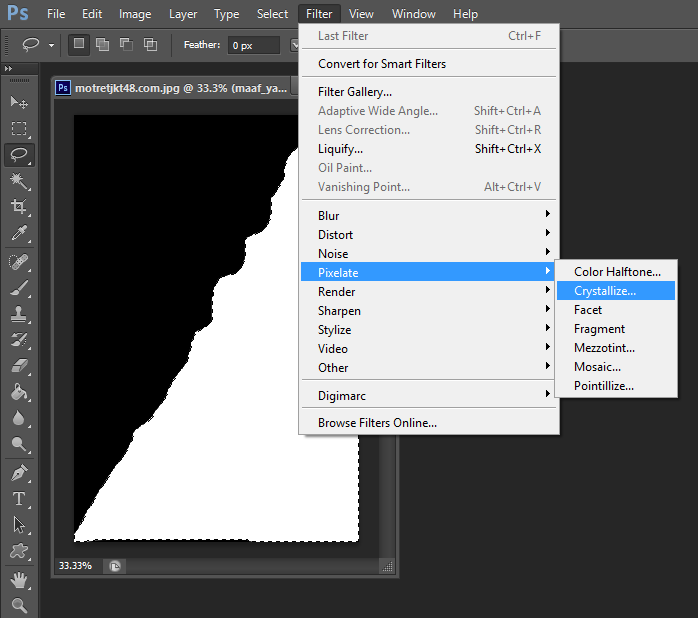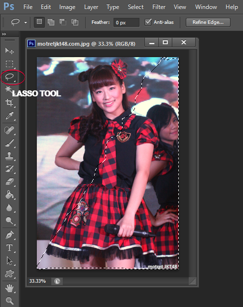 Buatlah seleksi pada gambar dengan menggunakan lasso tool. Buatlah agar seleksinya memotong sebagian dari gambar hingga ke salah satu tepinya, lebih jelasnya bisa dilihat pada gambar ilustrasi tutorial dibawah ini.