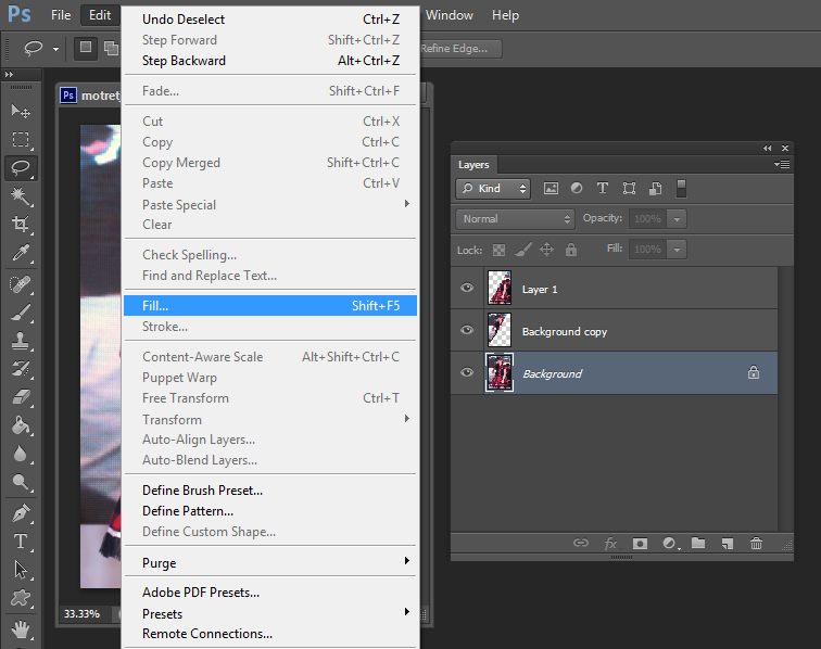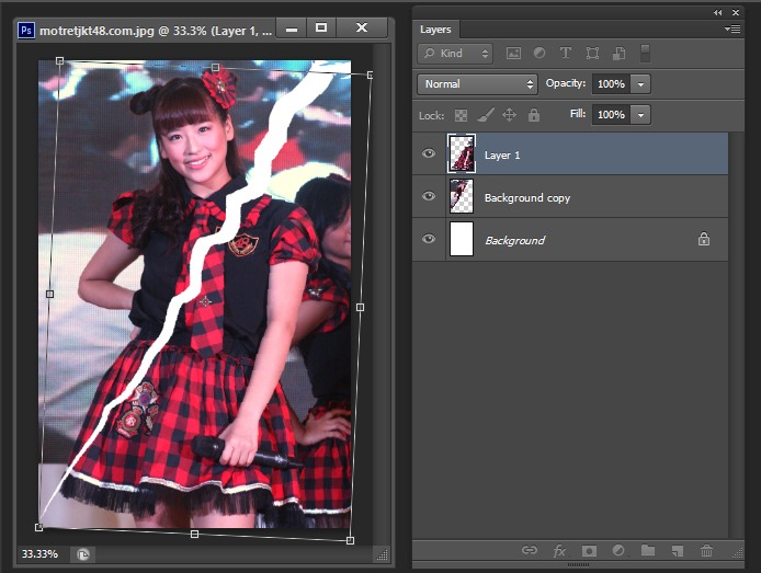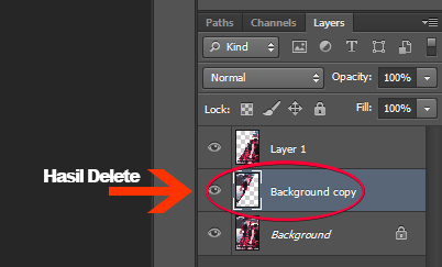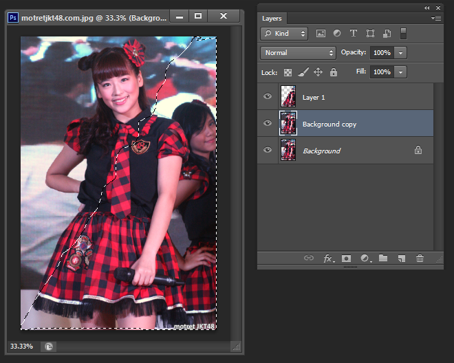 Ctrl + klik pada nama layer 1 (yang merupakan layer hasil potongan). Layer yang aktif masih tetap pada layer Background copy.