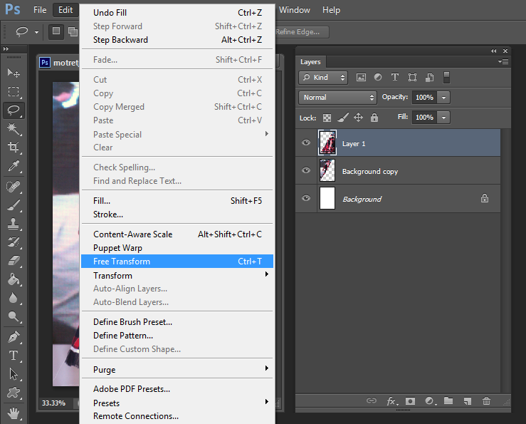 Atur ukuran dan posisinya dengan cara memilih menu Edit > Free Transform atau tekan Ctrl + T. Begitu juga dengan layer Background copy.